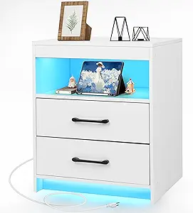 I recently purchased the Nightstand with Charging Station and LED Lights and this has become one of my new favorite furniture items in bedroom. White finish is really modern and clean on the eye and looks so good with my decor. I adore the integrated charging dock of the nightstand- so convenient to charge the phone and the tablet nearby the bed and not to bother them by extra wires. The LED lamps produce a pleasant comfy light which is best suited as a night light. The two drawers are quite large and can hold all my necessities and the open shelves are ideal to hold books and decor as well. The night stand is made well and is really heavy but not by any means light weight. Fitting was easy and no time at all. The height and size is just right to fit well in to my side next to my bed and it does not take up space. The design of the whole set itself is practical and it makes my bedroom more stylish and clean in look. I would strongly consider this nightstand to anyone who would want a functional yet elegant piece in his bedroom.